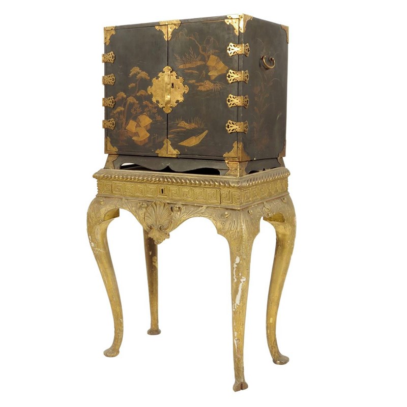 A Japanese black lacquer cabinet, with engraved gilt metal mounts and hinges the doors decorated a watery landscape enclosing five long drawers, the sides with carrying handles, on an associated George II giltwood stand, the Greek key frieze fitted a drawer to a shell and leaf carved apron on cabriole legs and carved pad feet, 119.8cm high, 65.8cm wide, 37cm deep.