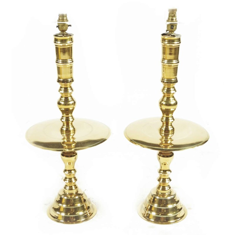 A pair of turned brass table lamps, with large drip-pans, the undersides stamped 'MADE IN SIAM', 59.3cm high excluding fittings, 27.4cm diameter. (2)