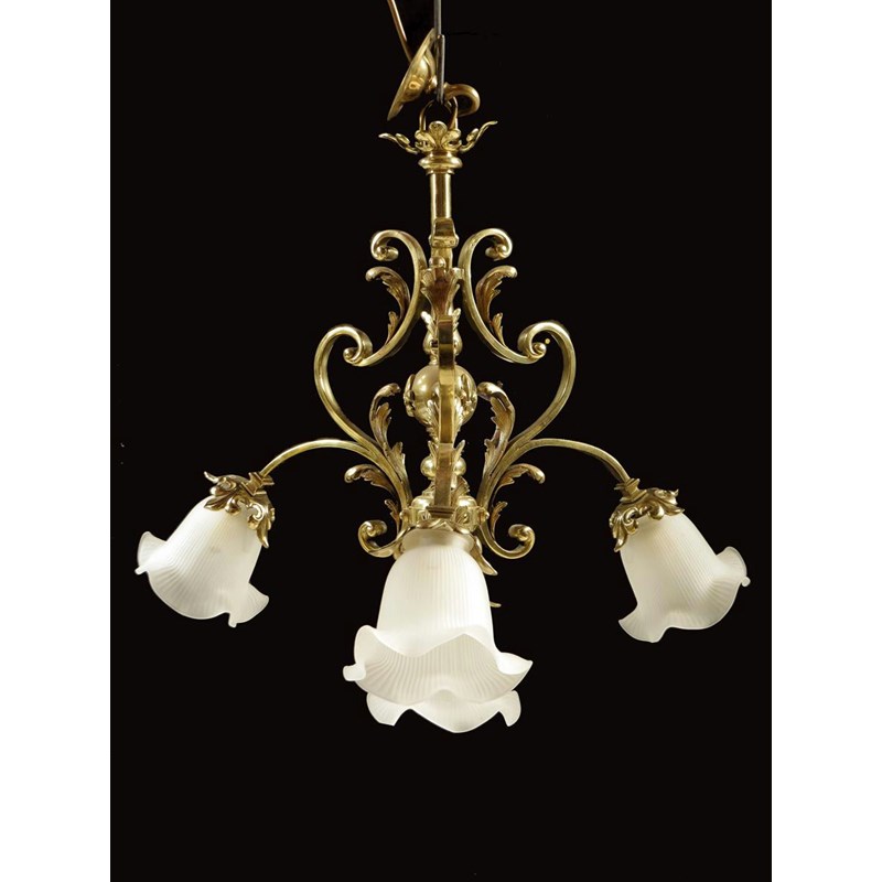 A brass ceiling light, with leaf scroll branches and four lights, with ribbed frosted glass flower head shades, 46cm high, 45cm wide.