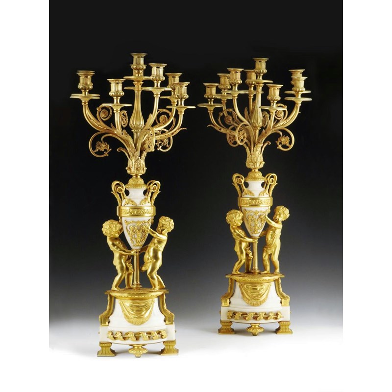A pair of French ormolu and marble candelabra in Louis XVI style, each with eight lights with leaf scroll branches to an urn stem supported by two cherubs on a leaf and draped fluted base, 80.3cm high, 32.6cm wide. (2)