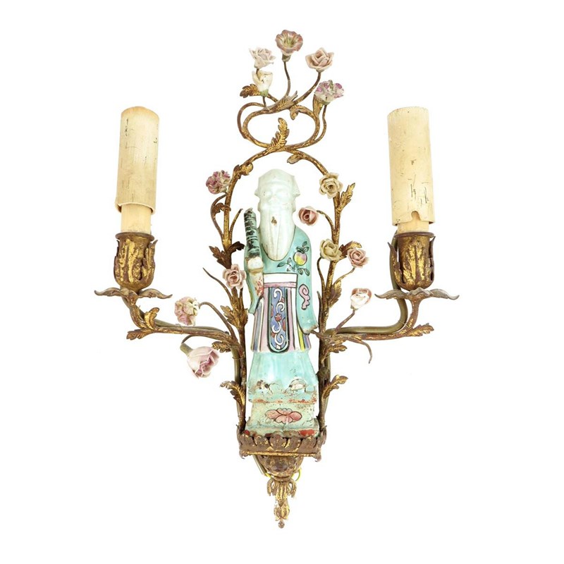 A pair of gilt metal and porcelain mounted twin light wall appliques, each with a turquoise and famille rose Chinese figure standing beneath an arch of flowers with mother of pearl shades, late 19th / early 20th century, 41cm high, 36cm wide. (2)