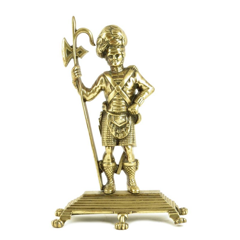 A Victorian brass doorstop, in the form of a standing Scottish Highland soldier, on a stepped base and paw feet, 35.3cm high. 23.8cm wide.