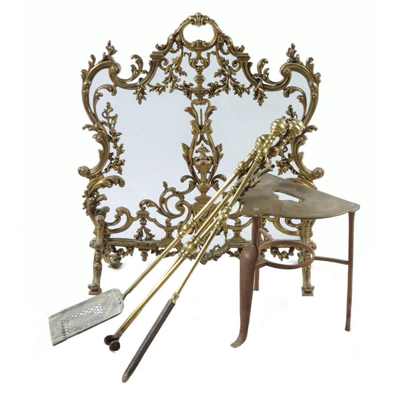 A late 19th century brass fire-screen, 76.3cm high, 67.5cm wide, 22,5cm deep, together with a set of three brass fire tools and a trivet. (5)