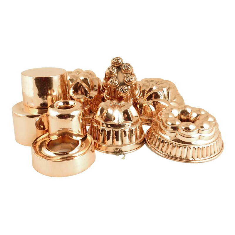 Nine copper jelly moulds, of various designs, one by Benham & Froud, numbered, '619' and with orb and sceptre mark, another stamped 'U.S.C.', 13.5cm high, 23.2cm wide, max. (9).
