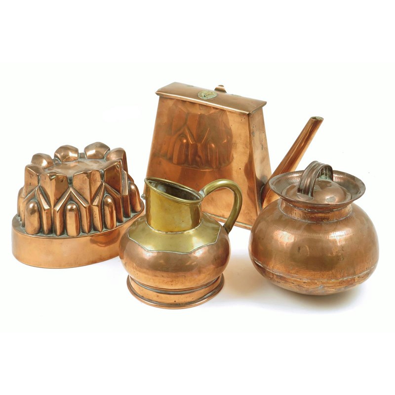 A Victorian copper jelly mould by Benham & Froud, with maker's mark and numbered '607', 11.3cm high, 17.2cm wide, and three other copper pots and jugs. (4)