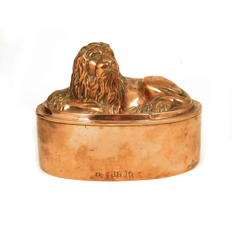 A Victorian copper jelly mould, in the form of a recumbent lion, inscribed 'GIBBS 40', 15.5cm high, 21cm wide, 12.7cm deep.