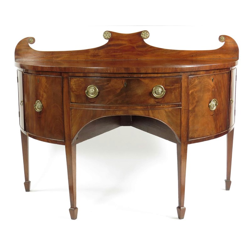 A Regency mahogany demi-lune sideboard, the raised scroll back applied with gilt brass flowerhead rondels, above a central frieze drawer flanked by two deep drawers, one divided, and two cupboards, fitted with later brass handles, on square tapering legs and spade feet, 108cm high, 148.9cm wide, 67cm deep.