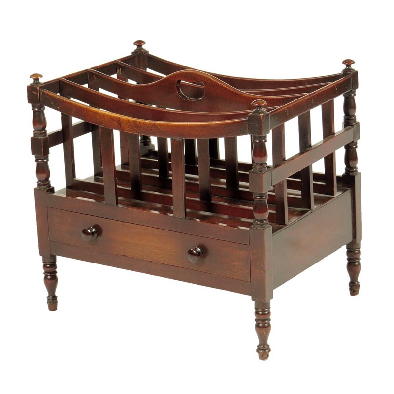An early 19th century mahogany Canterbury, with four dipped divisions and a central handgrip above a frieze drawer, originally on castors, 43.4cm high, 47.7cm wide, 34.2cm deep.
