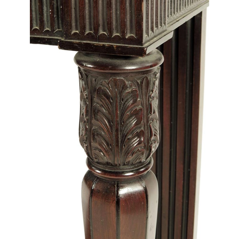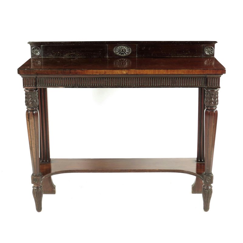 An early 19th century mahogany console table, inlaid ebonised stringing the later raised back with a central patera and end rondels above a fluted frieze on acanthus carved and faceted tapering front legs and fluted block back legs, united by an undertier, with some alterations, 100.5cm high, 118cm wide, 40cm deep.