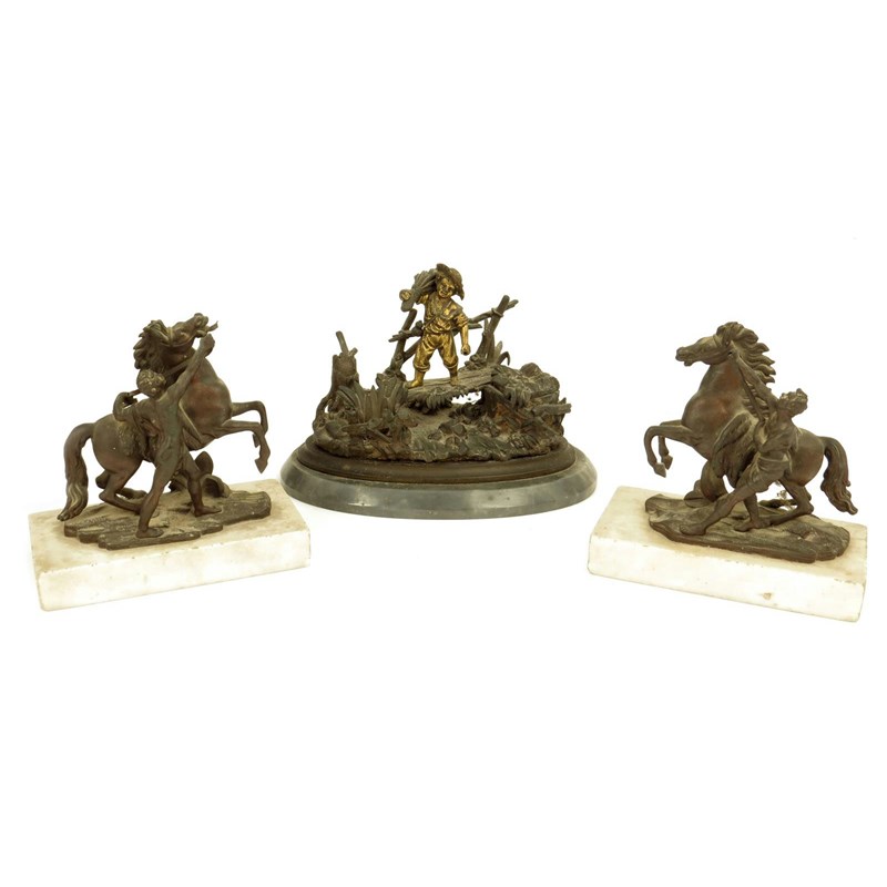 A pair of 19th century bronze Marly horse groups, on marble bases, 13.8cm high, 14cm wide, together with a 19th century gilt and patinated bronze inkwell, naturalistically modelled with a young boy holding a sheaf of wheat, on a marble base. (3)