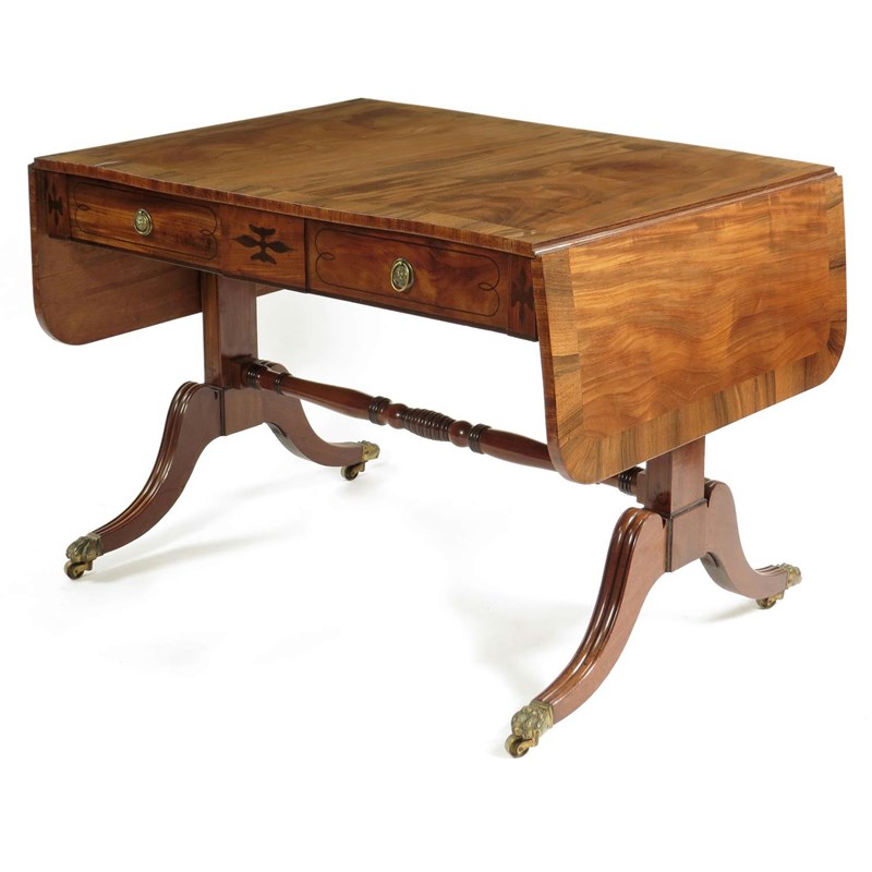λ A late Regency mahogany sofa table, with ebonised stringing, the drop-leaf top crossbanded in rosewood, above two frieze drawers fitted with lion's mask handles, with false front to the reverse, with solid trestle ends united by a turned stretcher on gilt brass paw sabots and castors, 72.1cm high, 101cm closed, 76cm deep.