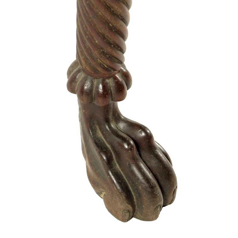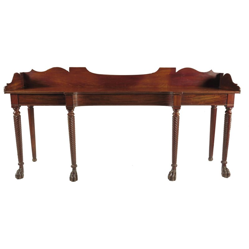 A Regency Irish mahogany breakfront serving table, the shaped three quarter gallery on turned spiral twist front legs and carved paw feet, 112.9cm high, 234.6cm wide, 58cm deep.
