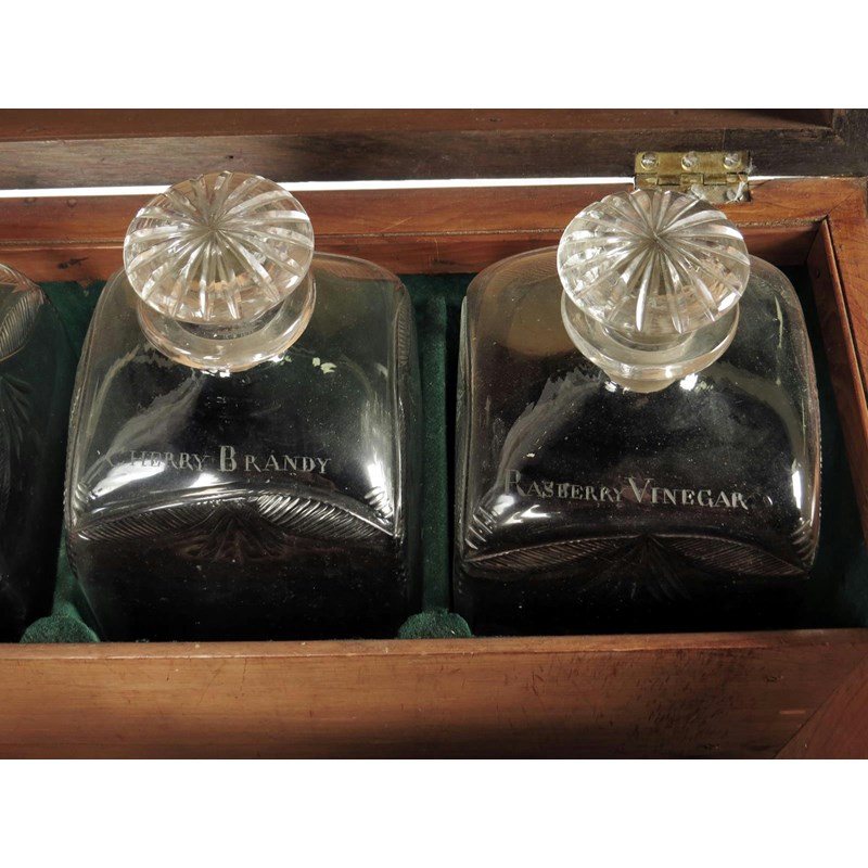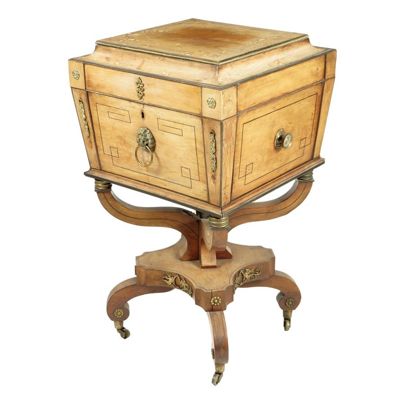 λ An early 19th century pine and rosewood banded sarcophagus shape cellaret, with gilt metal mounts and ebonised decoration, the hinged top revealing a divided interior with five glass decanters and stoppers inscribed 'GENEVA', 'CHERRY BRANDY', 'RUM', 'RASPBERRY WHISKY' and 'RASPBERRY VINEGAR', on scroll supports to quatreform base and brass caps and castors, 86.5cm high, 49cm wide, 46.5cm deep.