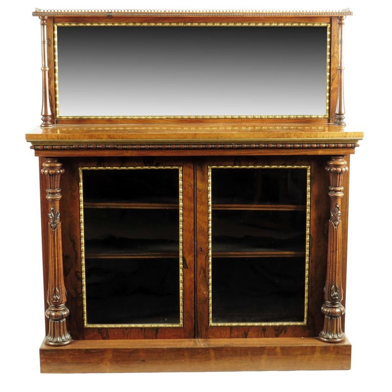 λ A George IV rosewood and giltwood side cabinet attributed to Gillows, the raised mirror back with a brass gallery on turned columns to an amboyna top above a pair of glazed doors enclosing two adjustable shelves, the brass hinges stamped 'HORNE PATENT', flanked by leaf carved columns on a plinth base, 136cm high, 121.8cm wide, 37.4cm deep.