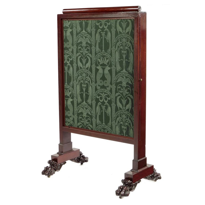 A William IV mahogany fire-screen, with a lift-up panel having a baton top and two side panels, on carved paw feet and brass castors, 45¼in (115cm) high, 28¼in (71.6cm) wide, 18in (45.6cm) deep.