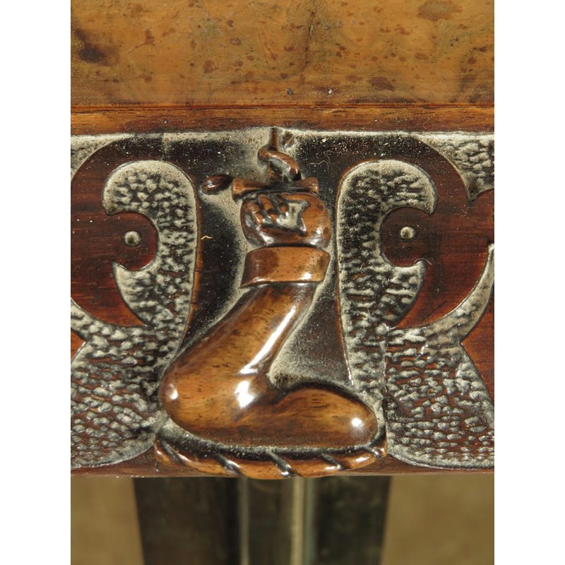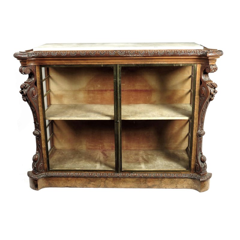 A Victorian walnut side cabinet, with an inset white marble top to a blind fret carved edge, centered the Legh family crest of an arm holding a serpent above a pair of brass framed glazed doors enclosing an adjustable shelf, flanked by carved corner pilasters 108.3cm high, 148.7cm wide, 55.5cm deep.