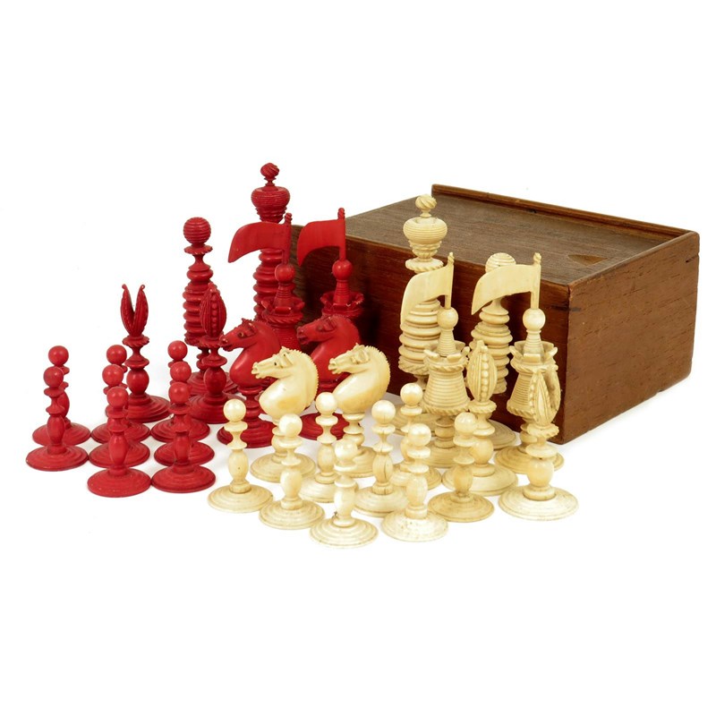 λ A 19th century turned ivory chess set, natural and stained red, the king: 10.7cm high, the pawn: 3.6cm high, in a mahogany box. (33)