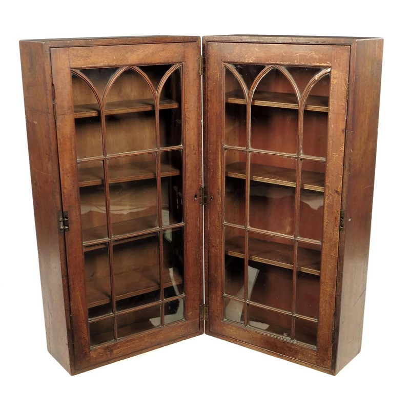 An early 19th century mahogany folding Campaign bookcase, the interior with a pair of lancet astragal glazed doors enclosing adjustable shelves, 105.6cm high, 105cm wide (open), 20.5cm deep.