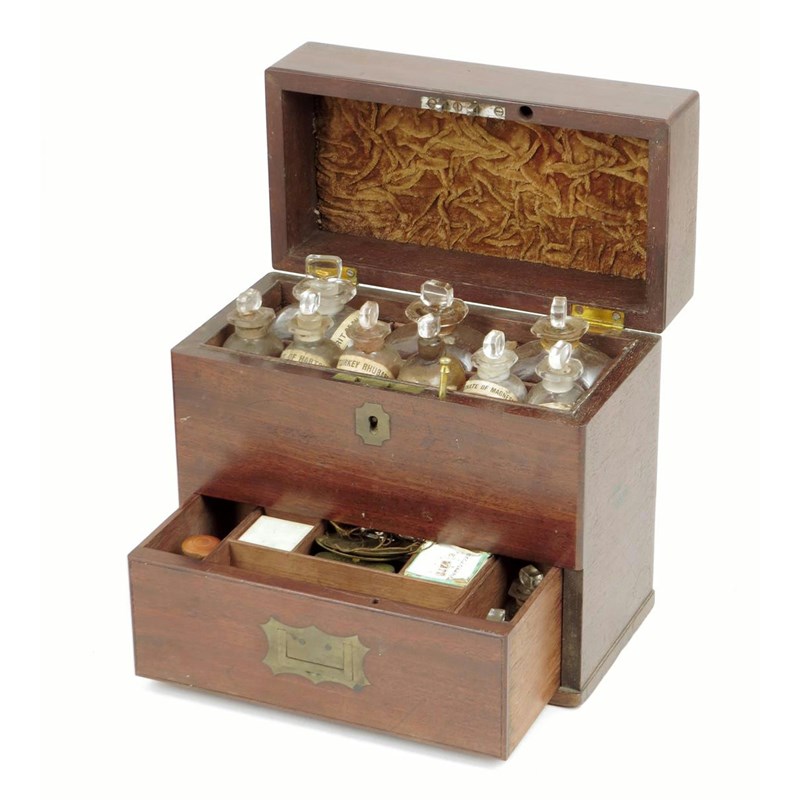 λ An early 19th century mahogany apothecary's box, with sunken brass handles, the divided interior with nine glass bottles and stoppers, some with labels for 'J. B. LANGFORD, CHEMIST, WELLINGTON' and other labels for the previous contents ' AMMONIA', 'SPIRIT OF HARTSHORN', 'POISON', with a base drawer fitted with further bottles, a brass scales and tortoiseshell fleams, 21.9cm high, 23.5cm wide, 12cm deep.