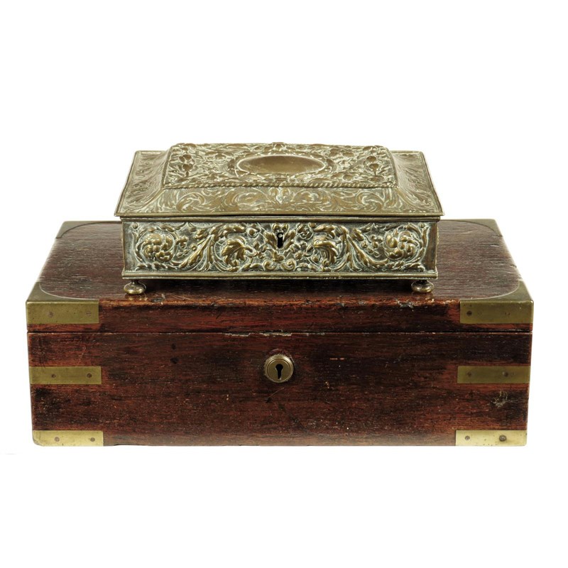 A 19th century oak and brass bound box, the lid with a sunken brass handle, 12.1cm high, 39.5cm wide,. 25 cm deep, together with a brass repoussé decorated box. (2)