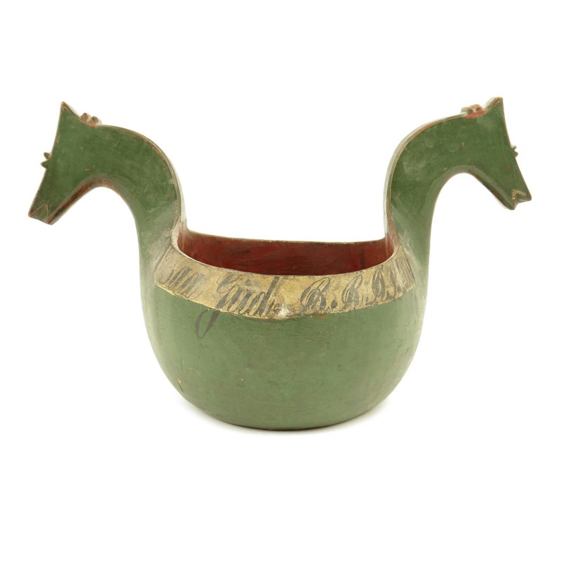 A 19th century Norwegian painted and carved wood kasa, with horse's head handles to an inscribed rim and dated '1858', 19.3cm high, 33.3cm wide.
