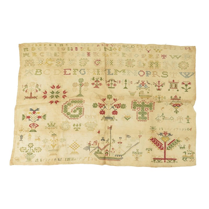 A George III needlework sampler, worked with vases of flowers, figures, a ship, a cot, animals, alphabets, the initials 'G T' and the date '1793', unframed, 41.3 x 59.7cm.