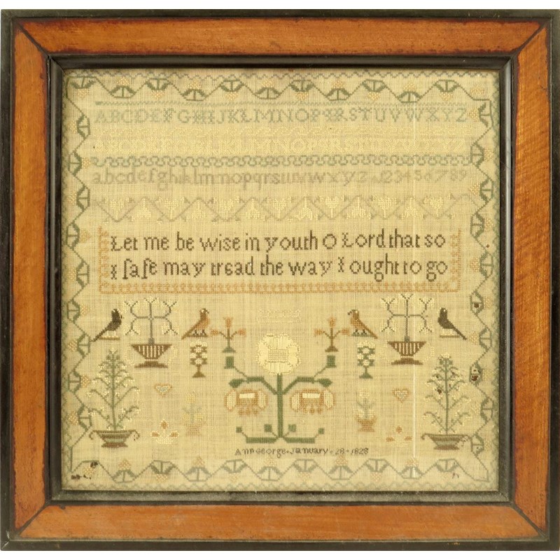 A George IV needlework sampler by Ann George, worked with birds, vases of flowers, an alphabet and a verse, signed and dated 'January 28 1828', 30.1 x 31.7cm, in a glazed moulded frame.