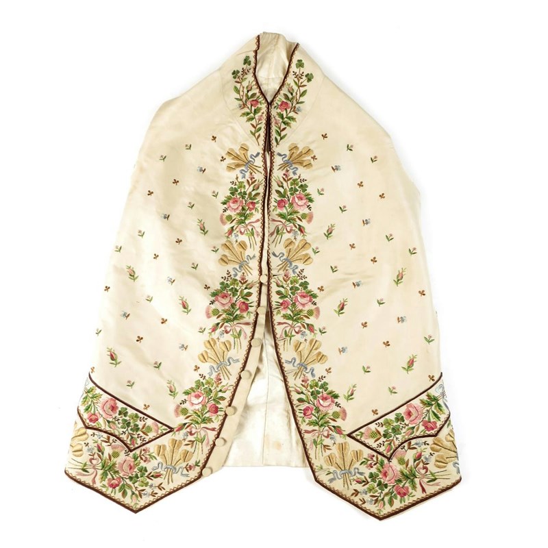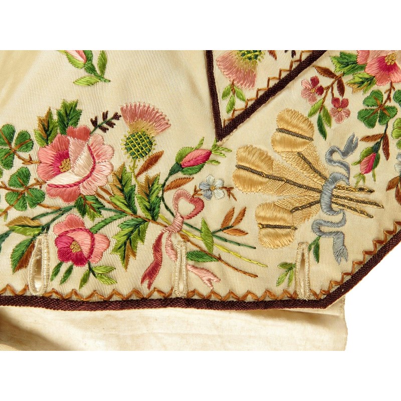 A George III Irish silk gentleman's waistcoat, embroidered in bright coloured silks with English roses, Scottish thistles, Welsh plumes of feathers and Irish shamrocks to probably commemorate the Act of Union in 1801, 69.7 x 43cm.