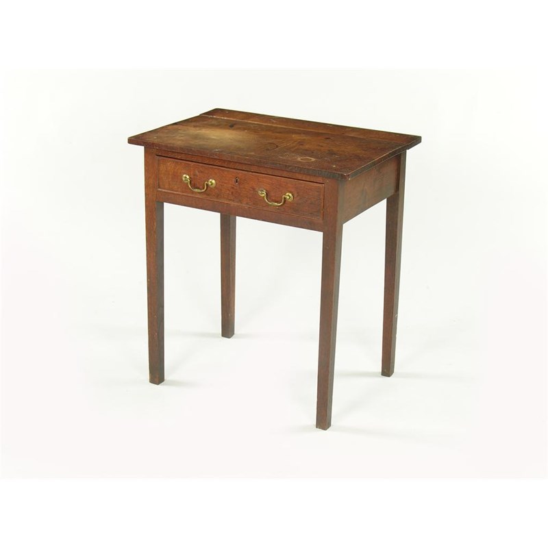 A George III oak side table, the rectangular boarded top above a frieze drawer fitted original brass handles, 28.75in (73cm) h, 26in (66cm) w, 18in (46cm) d.