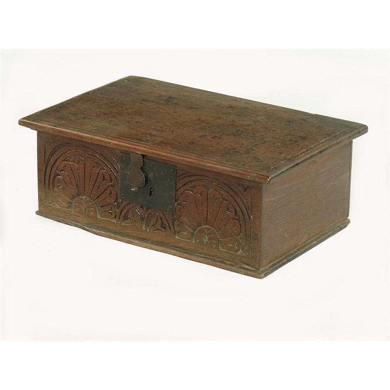 A late 17th century oak boarded box, the detached cover with incised line band above a lunette carved frieze, 8in (20cm) h, 22in (56cm) w, 14.75in (37.5cm) d.