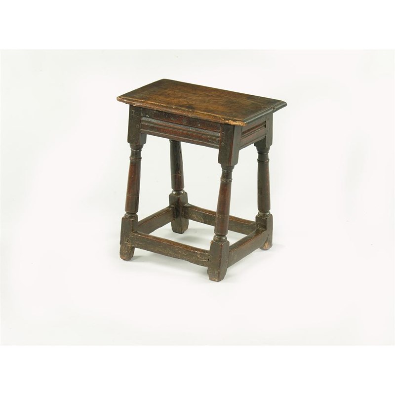 A late 17th century oak joined stool, with a moulded band frieze on turned tapering and block legs, 21in (53.2cm) h, 18in x 10.75in (45.8 x 27.2cm).