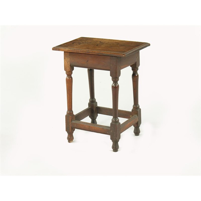 An 18th century oak high joined stool, the moulded edge rectangular top on turned tapering and block legs, 23.75in (60.4cm) w, 13in (33cm) d.