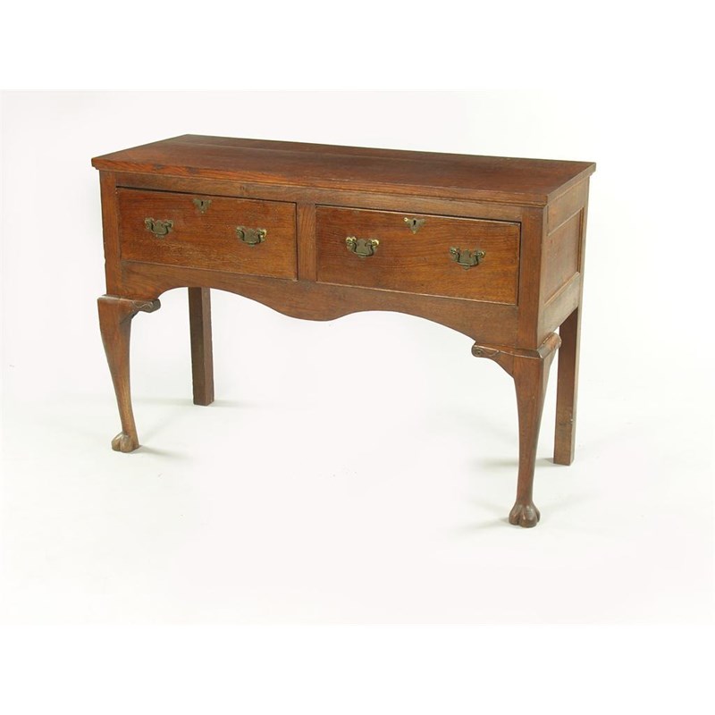 An oak dresser, the boarded top on carved bracketed tapering legs to trefoil feet, early 20th century, 33in (84cm) h, 49in (124.5cm) w, 18.75in (47.5cm) d.