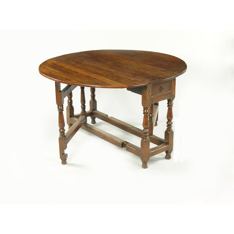 An oak gateleg table, the oval top on a late 17th century base, with a later end frieze drawer, 27.25in (69cm) h, 48.5in (123cm) open, 45in (114.2cm) d.