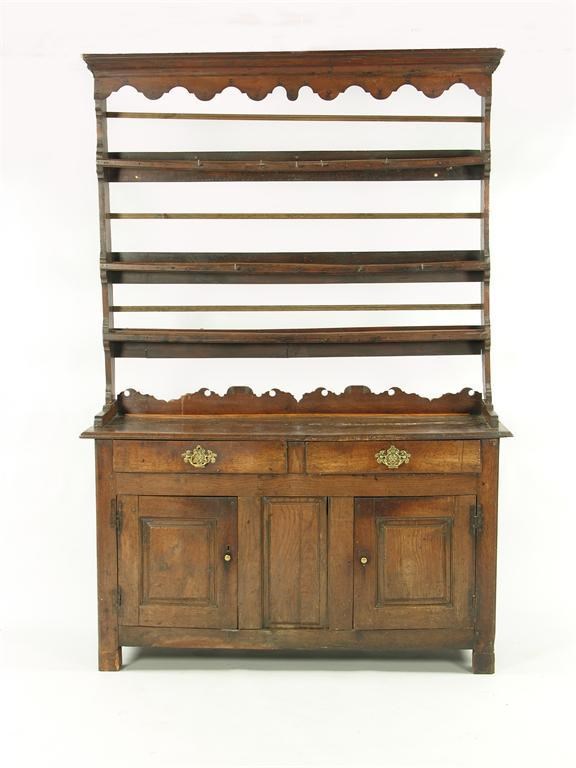 An oak dresser, the plate rack with a shaped frieze and apron, the frieze drawers above a pair of cupboard doors flanking a central panel, 18th century and later, 82.5in (209.5cm) h, 56.75in (144cm) w, 18in (46cm) d.