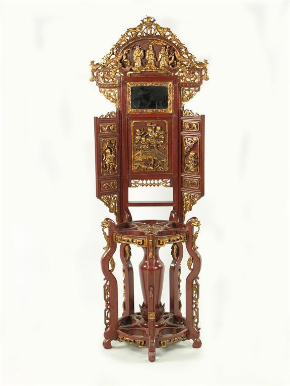 A Chinese carved wood and parcel gilt hall stand, 20th century, 66in (167.5cm) h, 24in (61cm) w, 19in (48.2cm) d.