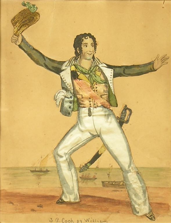 A painted and printed collage, depicting a sailor, inscribed 'J P Cook, 29, William,' 9.75 x 7.5in (24.8 x 19cm).
