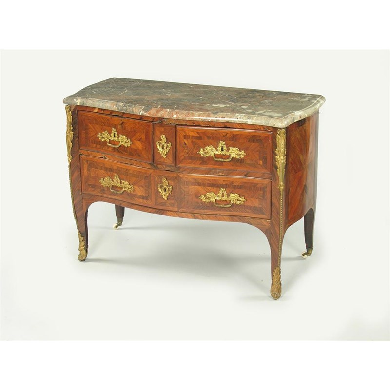 A Louis XV style kingwood commode, of serpentine outline, the moulded edge marble top above two short and one long drawer, quarter veneered and cross banded and fitted later ormolu handles, the back legs on later ceramic castors, 31.75in (80.6cm) h, 44.5in (113cm) w, 21.25in (54cm) d. Restoration.