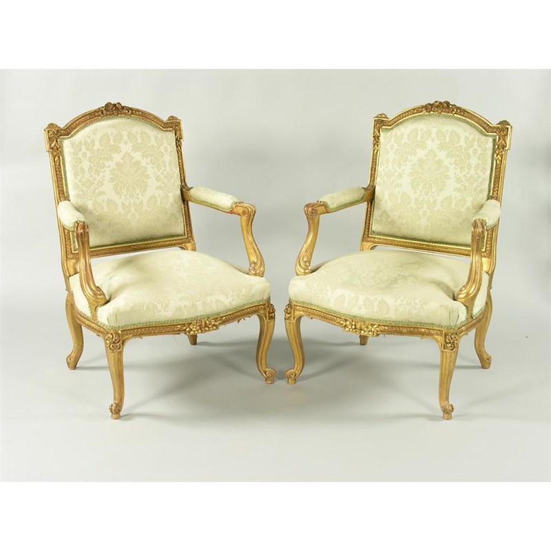 A pair of 19th century French carved giltwood fauteuils, the arched padded back to a foliage and guilloche frame with padded arms on scroll supports and a conforming base. (2)
