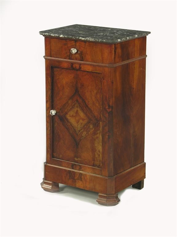 A 19th century French mahogany pot cupboard, with a fixed marble top, 30in (76cm) h, 16.5in (42cm) w, 12.5in (32cm) d.