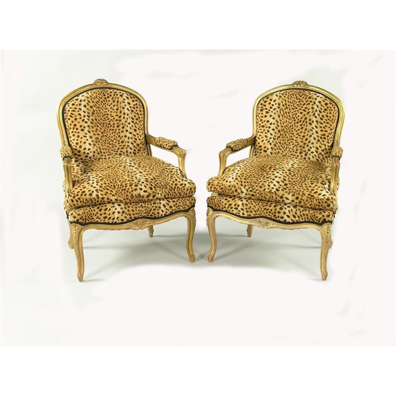 A pair of Louis XV style giltwood fauteuils, the carved and chanelled frames with leopard print upholstery, 20th century. (2)