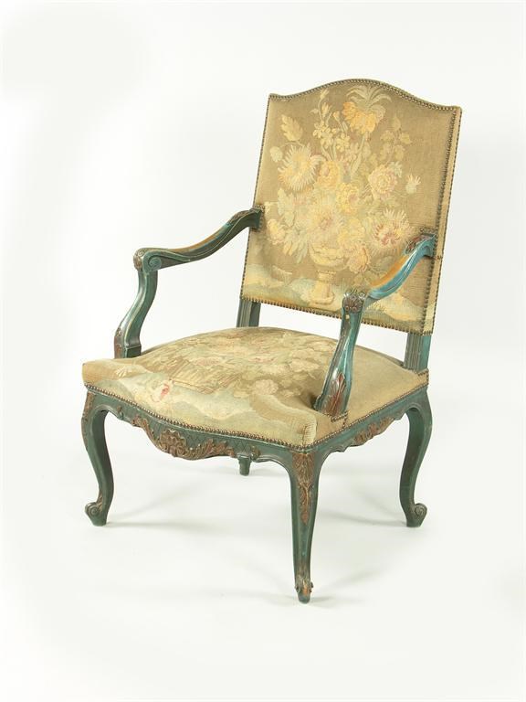 A Louis XV style painted carved wood fauteuil, with tapestry back and seat.