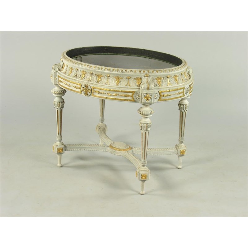 A French painted gesso and wood oval jardinire, with a lift-out liner, 29in (73.6cm) h, 36in (91.4cm) w, 28in (71cm) d.