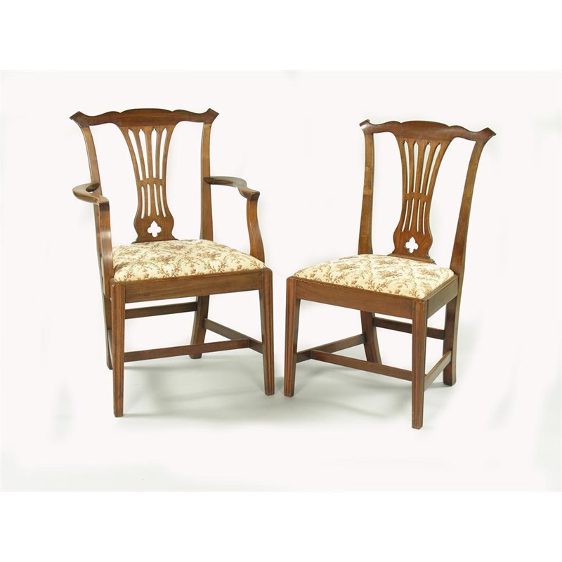 A set of eight 19th century mahogany dining chairs, comprising: a pair of open armchairs and six side, with later covered drop-in seats. (8). Old restoration.