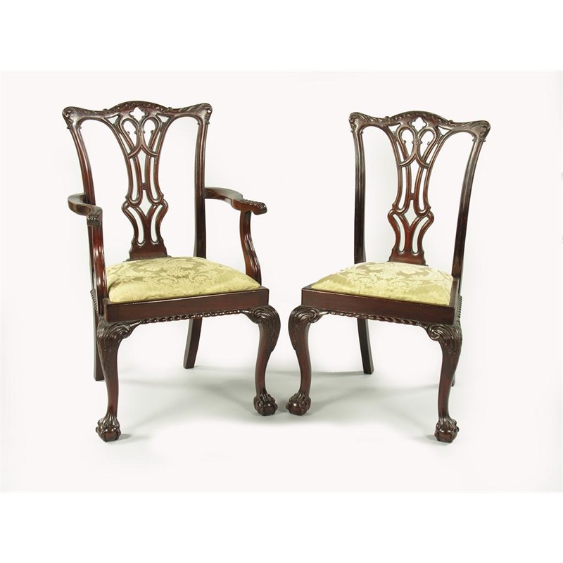 A set of eight mahogany dining chairs, in 18th century Irish style, with drop-in seats, comprising a pair of open armchairs and six side, 2nd quarter 20th century. (8)