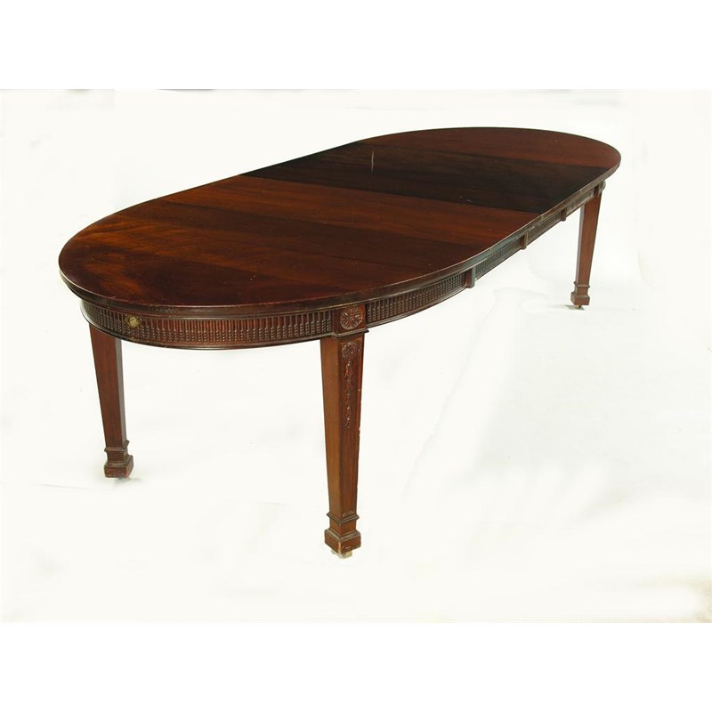 A mahogany extending dining table, with three extra leaves, the wind out mechanism by Joseph Fitter, the bead stop fluted frieze on husk decorated square tapering legs to brass castors, the underside stamped 'Ri, 948 25 6 27', early 20th century, 29.5in (75cm) h, 119in (302cm) extended, 45in (114.3cm) d. .