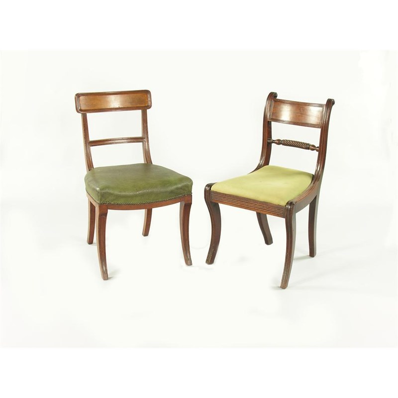 A pair of Regency mahogany rope back side chairs, with drop-in seats on sabre legs and another pair of Regency sabre leg side chairs. (4)