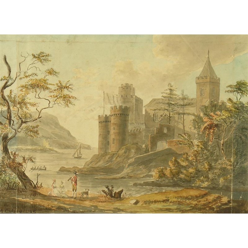 M.Cadoux. Figures by a lakeside castle, watercolour, signed and dated 1798, the verso inscribed 'M Cadoux fecit et pinx 1798, R M Academy, Given by him to Mrs Percivall as a Token of Friendship, April 21st 1799', 7.5 x 10.5in (19 x 26.6cm).