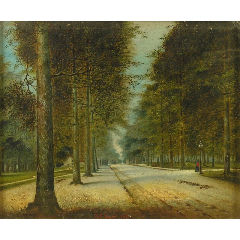 H. E. Locke. Wooded park scene with cottage and figure, signed and dated 1890, oil on board, 9 x 11in (23 x 28cm).
