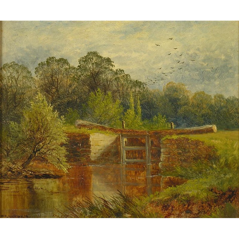 W.R. Whitby, 1877. River landcape with a lock, oil on canvas, signed and dated, 10.25 x 12in (26 x 30.5cm).